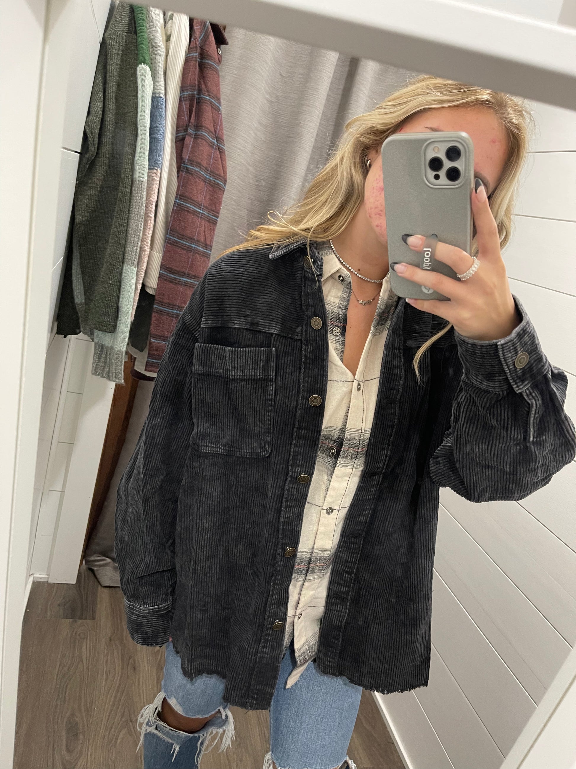 This corduroy layer features a washed finish for unique & lively flair. Cut in a oversized fit with a collar, button placket and matching button cuffs. Finished with dropped long sleeves, oversized front pocket at the front. This jacket is the perfect mix of classic and fun! The versatility of this jacket make it a closet staple that you will wear over and over again this season.