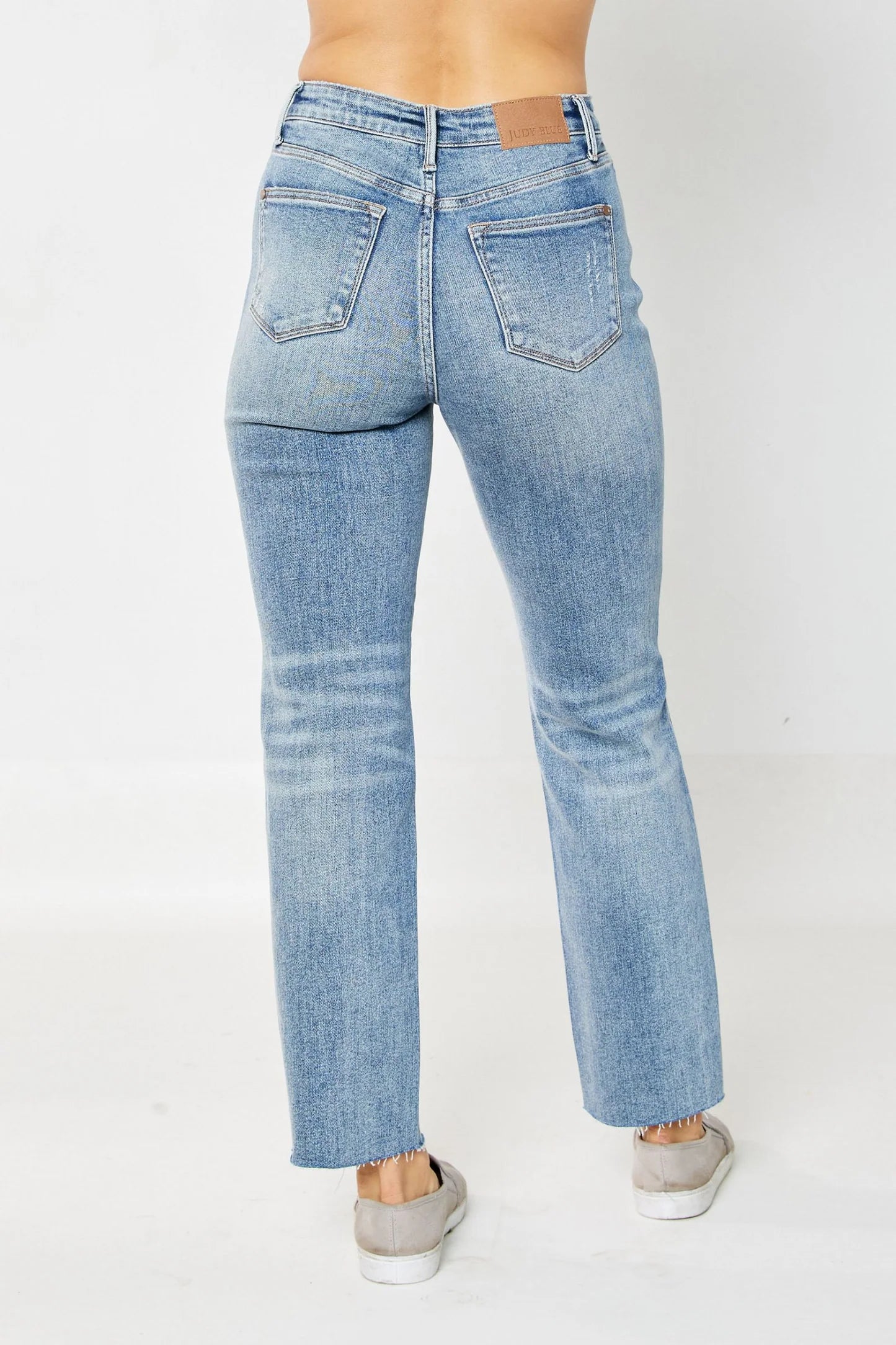 The Judy Blue Rigid Magic Destroy Straight Leg jeans are designed with a high waist for a secure and comfortable fit. Rigid 100% cotton in the front, signature Judy Blue stretch in the back, we've brought together the best of both worlds to create Judy Blue Magic. Crafted with soft and stretchy denim, they are perfect for everyday wear.