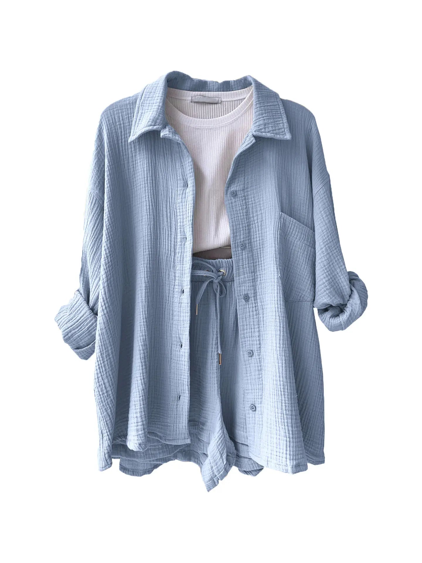 This Set is perfect for the summer weather. It comes as a matching set. Shown in the color tan to see the fit of the set.