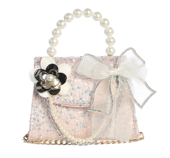 Sequin Purse with a large bow & flower with chains & a pearl handle.