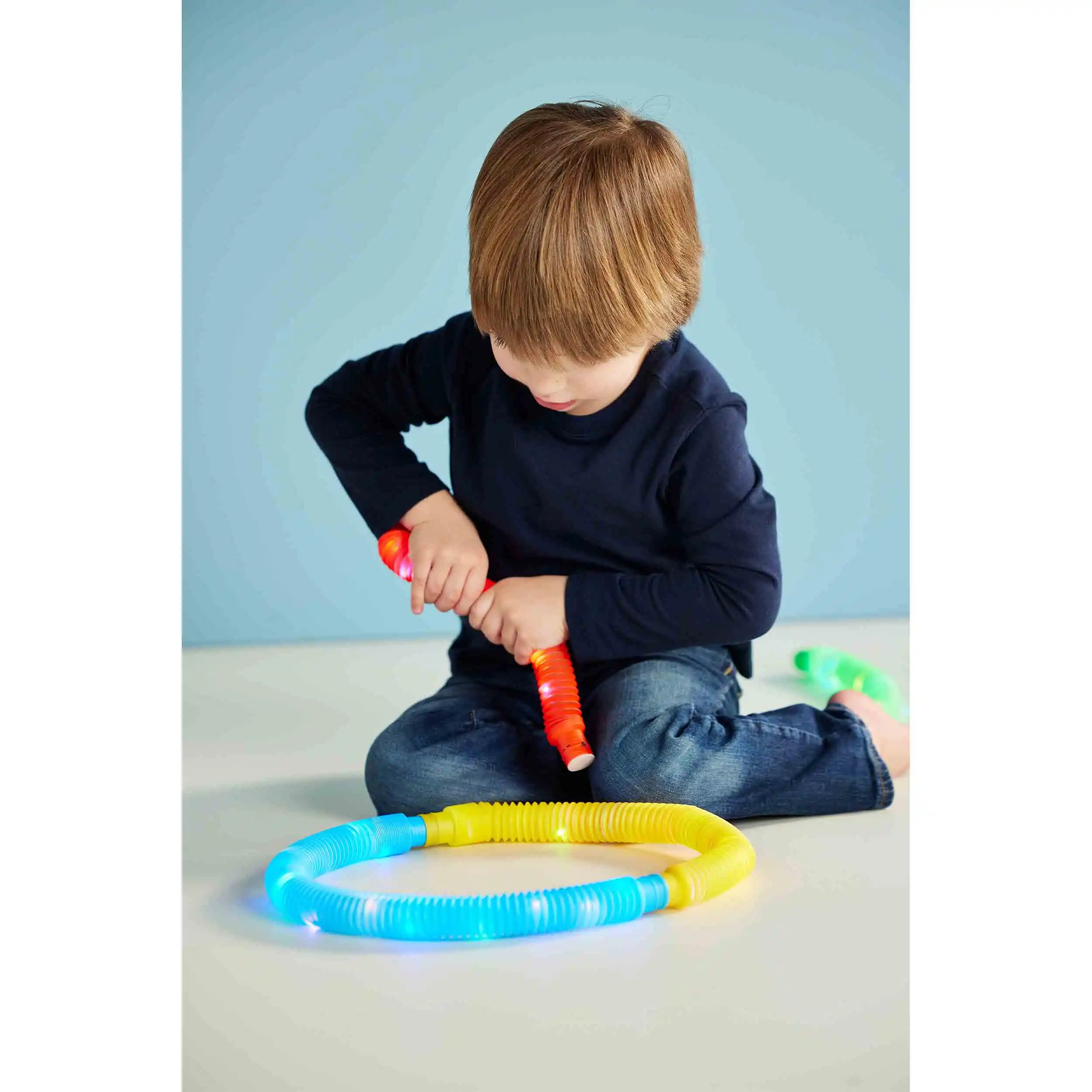 Experience the joy of our Pink/Blue Light Up Tubes - a must-have for parents! This set includes four vibrant, light-up plastic tubes that guarantee endless hours of entertainment. Designed for children aged three and above, these tubes are not only fun to stretch, pull, and pop but also promote sensory development. Crafted from durable plastic, these tubes are built to withstand active play. Get ready to witness the magic as these tubes illuminate with a mesmerizing glow. This set offers a variety of colors to captivate young minds. Conveniently packaged in a sturdy plastic tub, the set is perfect for storage and easy transportation. Bring home the excitement and let your child's imagination soar with our Light Up Tubes!