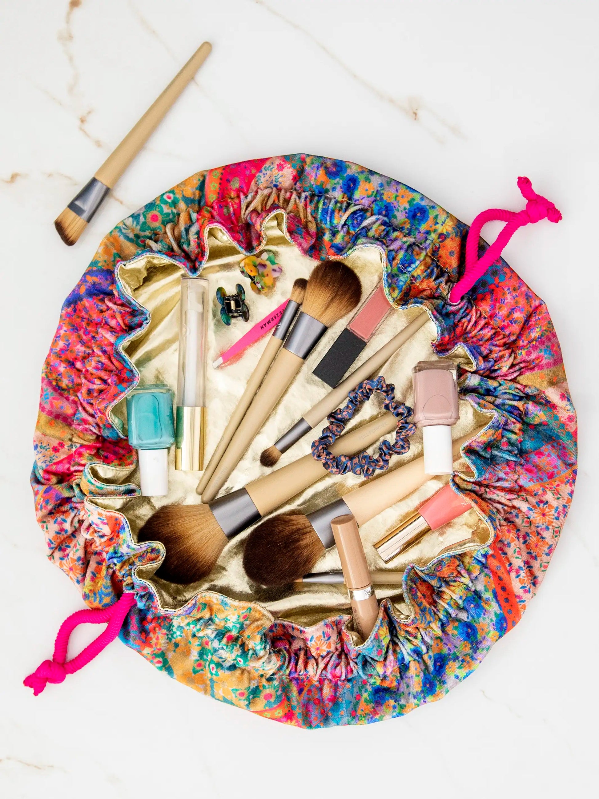 We're obsessed with this Drawstring Velvet Cosmetic Pouch! Use it to hold your make-up or toiletries when you travel. Un-tie the pouch on the counter and it acts like a mat for your products! Once you're finished, you can pull the strings and quickly wrap it all up... ready to go!