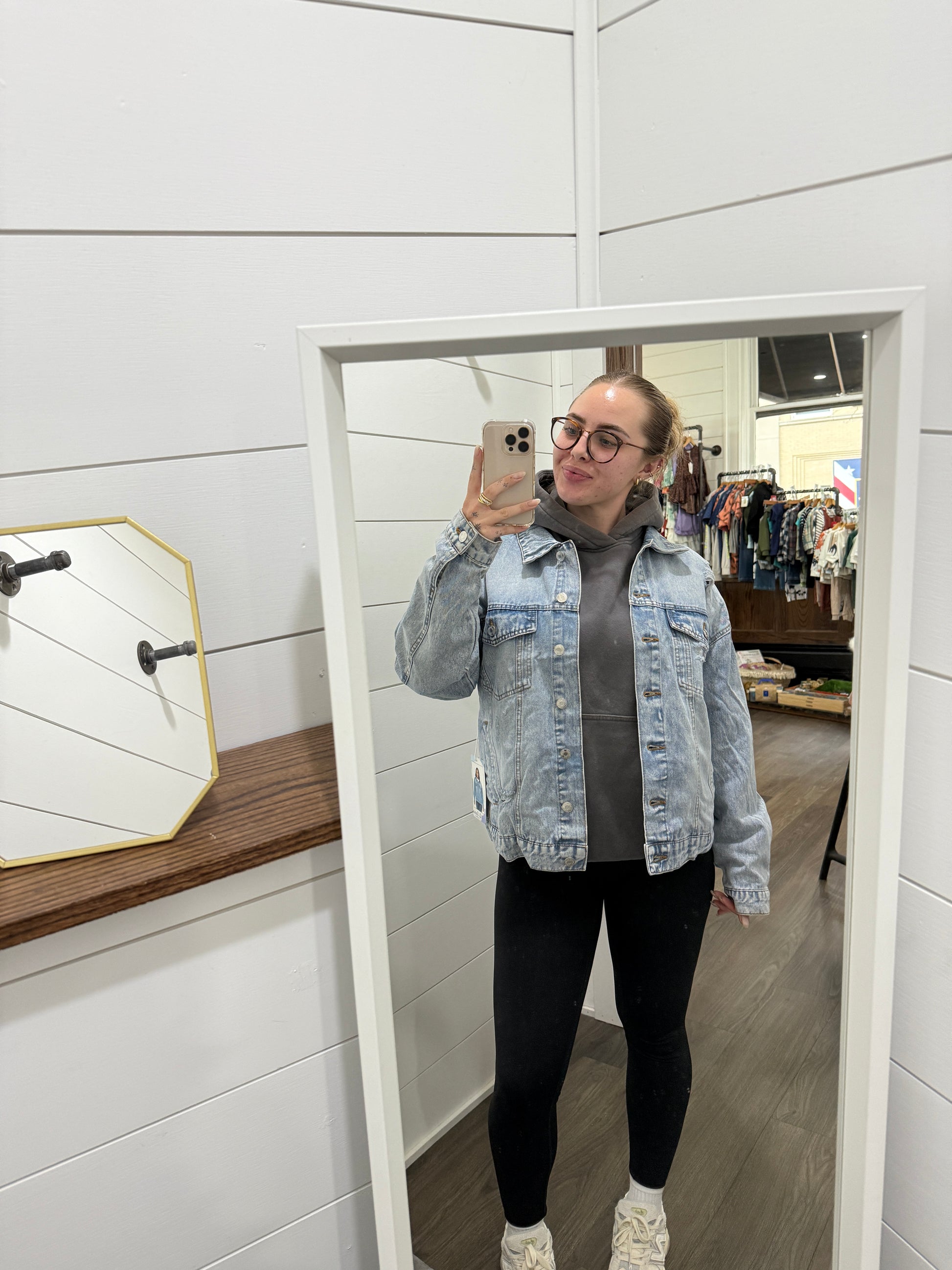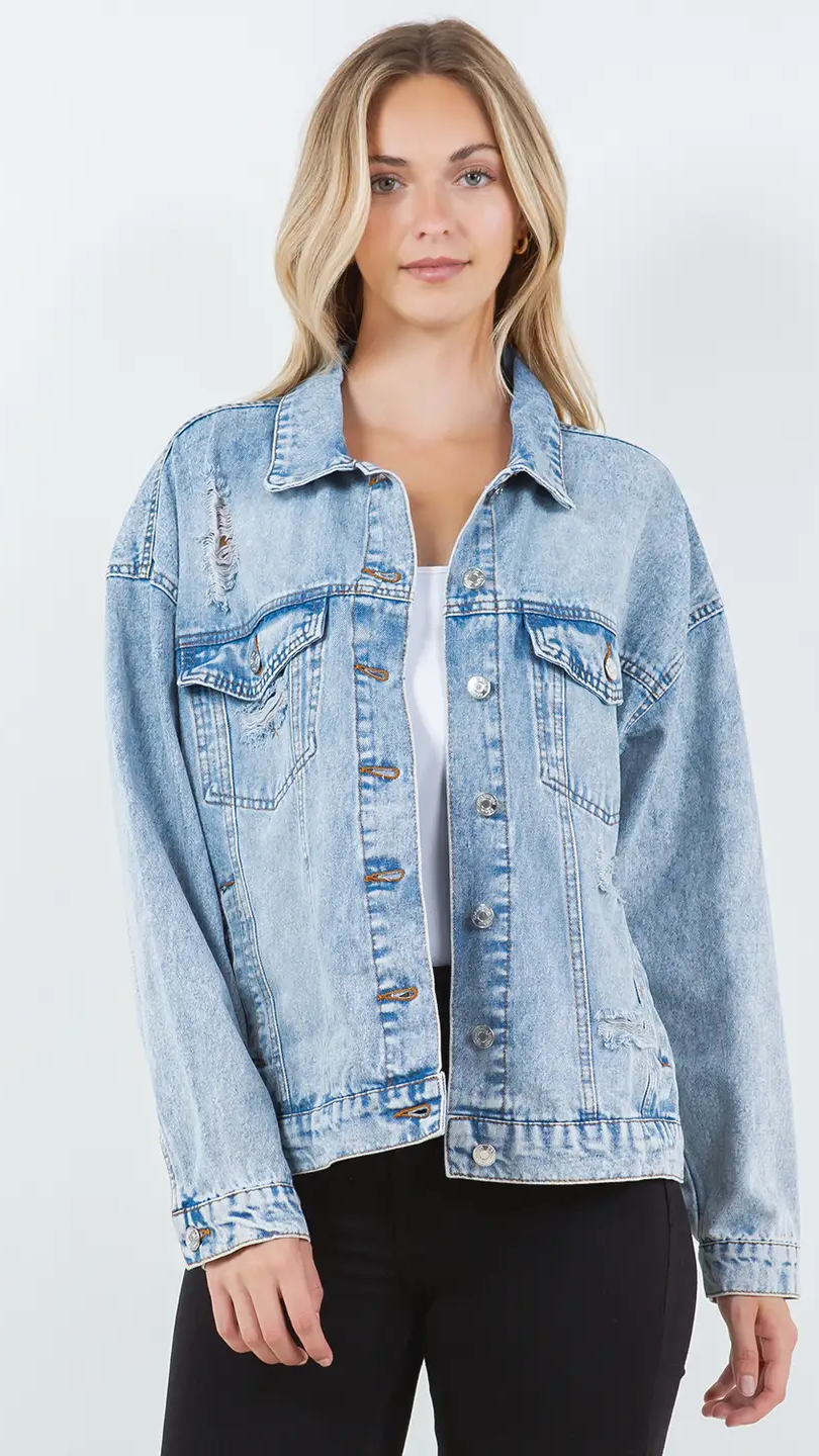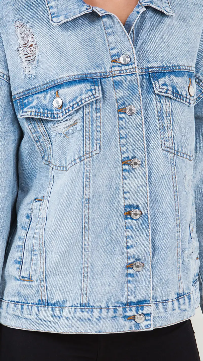 This throwback-inspired denim jacket comes in a cool, light wash and features a relaxed, straight fit that's perfect for layering. This jacket boasts a classic collar, button-front closures, and buttoned chest flap pockets for a quintessential denim look. Complete with slanted front pockets, dropped long sleeves with buttoned cuffs, and an oversized fit, it exudes effortless style and versatility. Point collar. Button closure. 2 Flap Chest Pockets. 2 Slant Side Pockets Functional buttons at cuffs. Unlined.