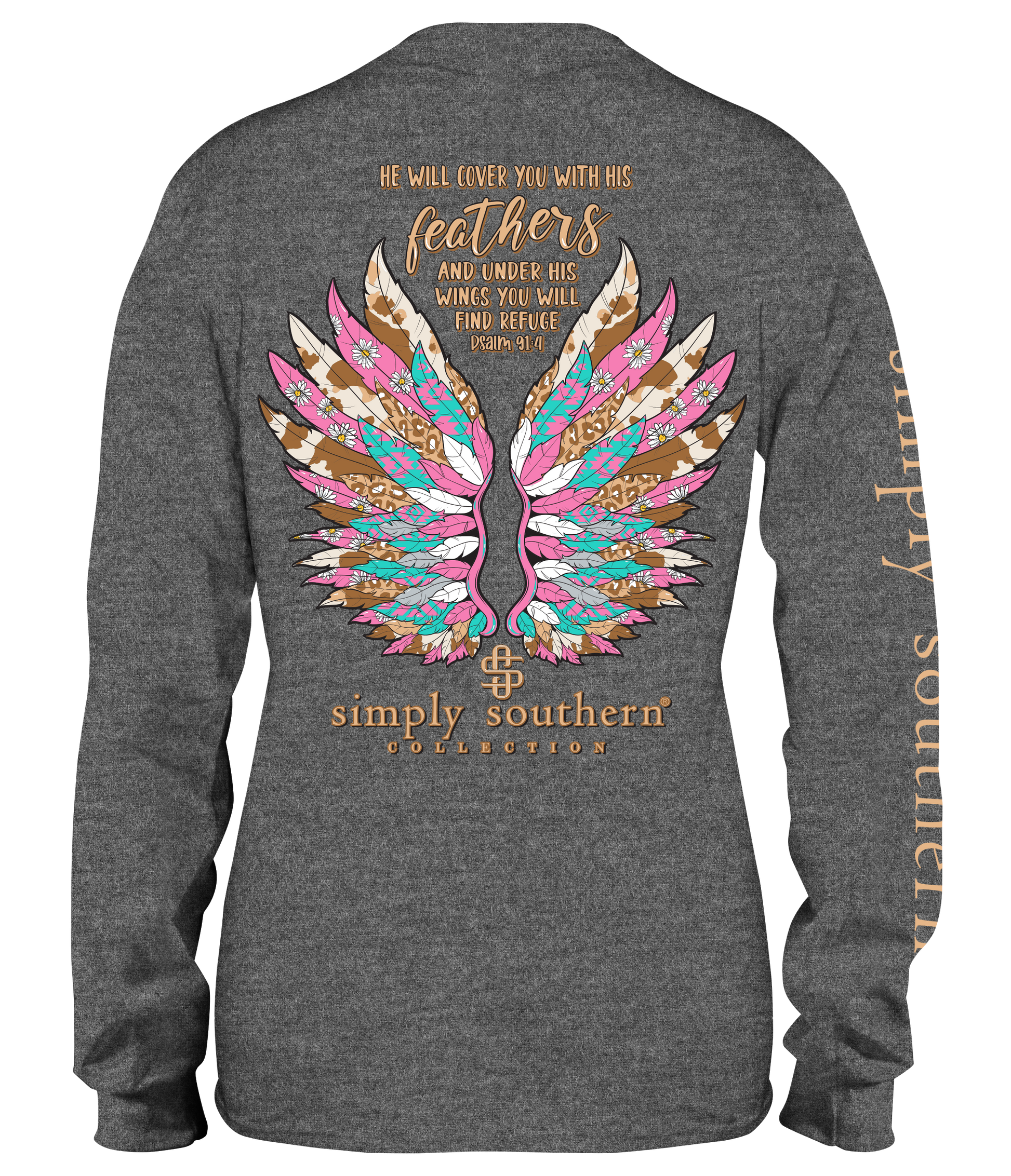 Dark heather gray long sleeve shirt with a pair of wings composed of multipatterned feathers and the verse HE WILL COVER YOU WITH HIS FEATHERS AND UNDER HIS WINGS YOU WILL FIND REFUGE PSALM 91 4. Simply Southern logo below, on left chest, and right sleeve. Pre-shrunk and ring-spun 100% cotton. Unisex youth sizing.