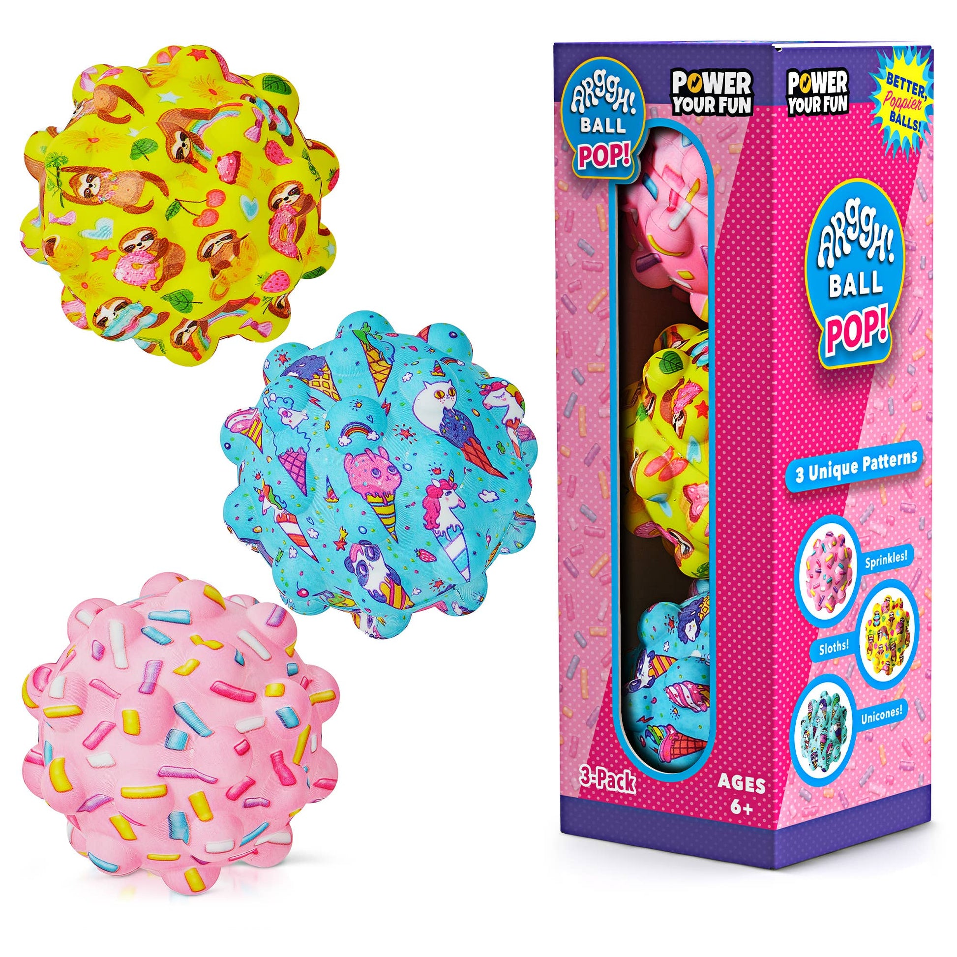 This sprinkles variant is great for boys and girls of all ages to reduce anxiety. It includes 3 ball pops with unique designs; ice cream teal, yellow funny sloth, and sprinkle pink.